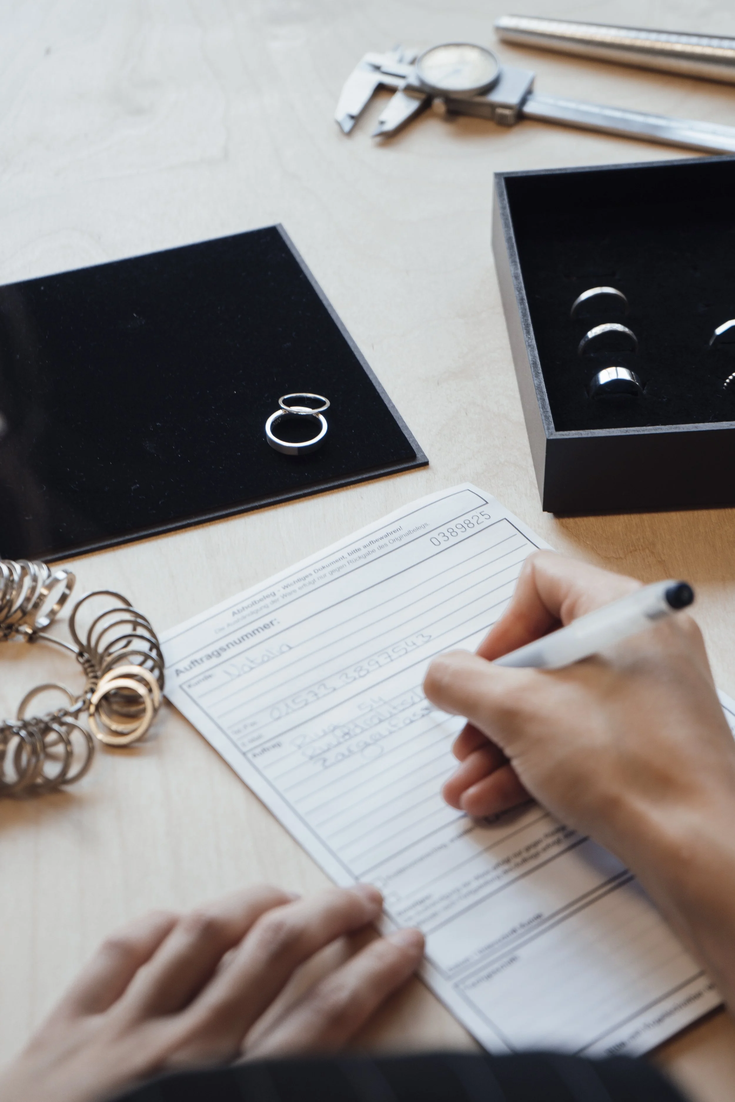 If possible, you can bring a ring that your partner is wearing with you to the consultation. Pay attention to which finger and which hand it fits. I can then simply measure the ring size of the piece of jewellery.